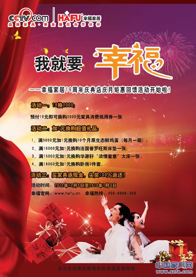 “我就要幸福”,幸福家居19年以來一直持守客戶擁有真摯祝福!服務超過十萬客戶的幸福時刻,讓幸福人感動,感恩!為此,幸福家居19周年店慶月矩惠回饋活動開始了!