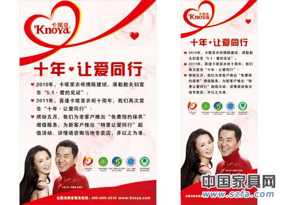 2010年4月,卡喏亞衣柜攜手陳建斌、蔣勤勤夫婦,于五一宣告“愛的見證”;今年,卡喏亞衣柜剛剛步入第十一個年頭,再次宣告“十年-讓愛同行”。