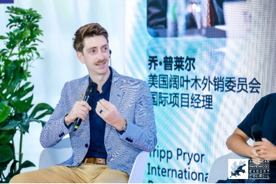 在研討會(huì)互動(dòng)環(huán)節(jié),美國闊葉木外銷委員會(huì)國際項(xiàng)目經(jīng)理喬·普萊爾先生從環(huán)境角度分析指出:“木材是極少數(shù)具備‘碳儲存’能力的建筑材料——樹木在生長過程中吸收二氧化碳,被制成家具或用于建筑后這些碳仍然能被鎖定在木材中。使用木材替代混凝土或塑料,可以顯著降低碳足跡,這是其它材料難以比擬的環(huán)保優(yōu)勢。”
