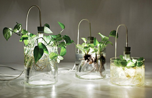 這三只玻璃器皿既是花瓶,又是燈,灌水之后種植一些可以在水中生長的綠色植物,通電打開燈光,植物的根系和枝葉就是對燈光的最純樸自然的裝飾。當然,燈是在另一個密閉空間里,并沒有泡在水中,不必擔心漏電問題…