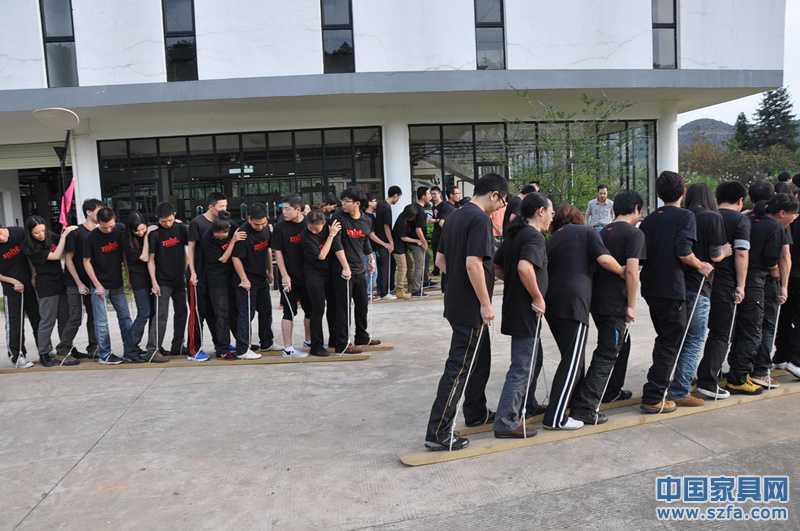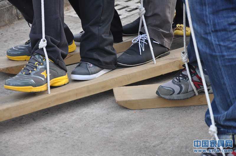 游戲規則:“從寸步難行,到小跑前進”,隊友手拉繩索,腳踩木板,一起走兩端40M左右的路。第一段路可以喊著口號通過,第二段路不準發出口號聲,否則要回到原點重新開始。