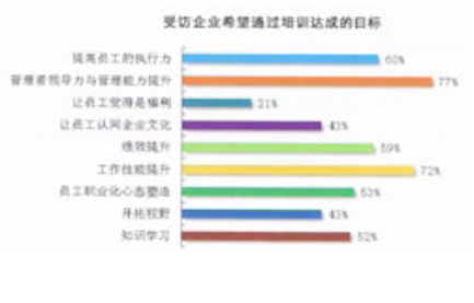 企業希望通過培訓達成的目標整體以學員的能力提高和績效提升為核心,也有43%的企業希望通過培訓讓員工認同企業的文化,有21%的企業將培訓定義為員工福利。