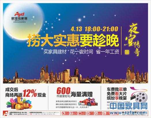 買家具建材,撈大實惠要趁晚!歐亞達家居夜宴通過兩周的醞釀終于揭開了神秘面紗。泉城的消費者終于找到“提前購買家具建材,五一放心旅游”的機會。本次活動歐亞達家居還推出了“花一夜時間,省一年工資”的口號,這句話放在裝修房子買家具這件事情上,意思是說通過歐亞達家居413夜宴帶來的極限優惠可以省掉您一年的工資。如此誘人的活動趕快來參加吧!