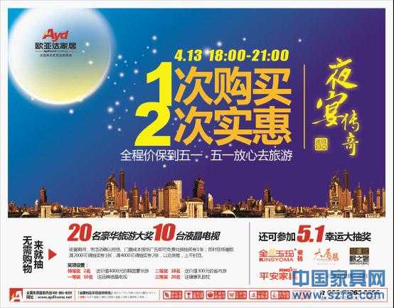 據悉,除了價保到五一的服務承諾外,為給消費者帶來更多的實惠,歐亞達家居還特別增加了“1次購買2次實惠”的活動內容。歐亞達家居的老顧客均有這樣的感受:凡是歐亞達推出的重大活動,活動中的獎品總是讓人眼前一亮,為之心動。夜宴活動推出的是旅游大獎,那五一活動是不是獎品更誘人?參加了這次活動豈不是錯過了五一抽獎?不要擔心,“1次購買2次實惠”就是為您解決這一煩惱,凡在這次夜宴活動期間成交的顧客均有機會參加五一幸運大抽獎活動,拿不完的神秘大獎等著您!想要買家具建材的您,歐亞達413夜宴在等您!