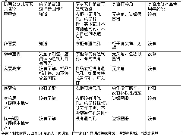以多喜愛家具為例,記者發現出售的衣柜有通風孔,可以防止孩子玩耍時藏在柜子中避免窒息的可能性發生,但是在尖角處理上,卻不能讓人滿意,店員對佯裝顧客的記者表示,“新國標”在某種程度上只對環保方面有所緩解,但是如果要避免孩子在玩耍時被柜子尖角磕傷的情況發生就作用不大,原因在于“以板材為原材料做成的家具想要把尖角變圓存在一定困難,而且造價會提升,這樣會流失一定的顧客。”記者發現,8月份以前的家具在多喜愛依然正在售賣,店員給出的解釋是“現在是一個過渡時期,8月以前不符合標準的家具不能全部下架”,同時,店員告訴記者,8月中旬會有一批新貨上市。