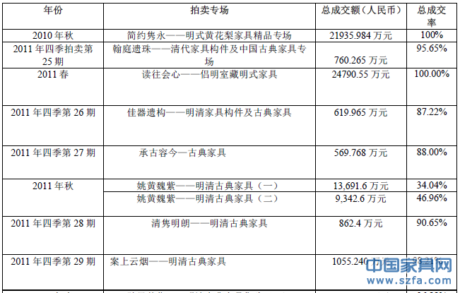 從2010年開始,“熱錢”進入藝術品市場絕對不是空穴來風。各大拍賣行的古典家具專場集中涌現,家具重器頻頻,亮點頗多,遠遠領先于其他藝術拍賣板塊,已然達到了一個高峰期。比如,中國嘉德“簡約雋永——明式黃花梨家具精品專場”就十分引人關注,全場不負所望,以總成交價達21935.984萬元,總成交率高達100%的好成績收槌。2011年春拍之際,“讀往會心——侶明室藏明式家具”專場成交額為24790.55萬元,成交額達100.00%。四季拍賣第26期、第27期,成交額和成交率皆表現不俗。
