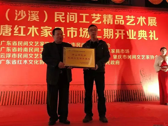 承載更多使命與責(zé)任,中山市民間工藝傳承基地落戶(hù)大唐紅木家具市場(chǎng)!由中山市民協(xié)主席李桂山向大唐紅木家具市場(chǎng)副總經(jīng)理方君明授予牌匾。