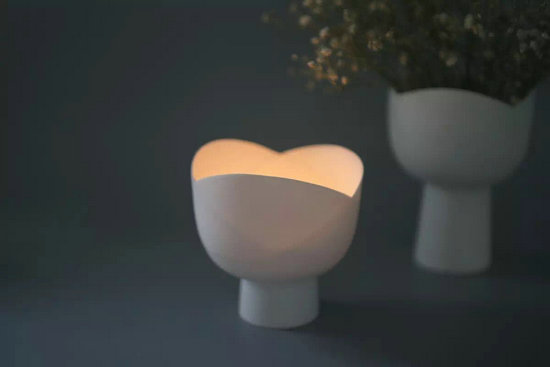 旻佳特別欣賞墨西哥舞娘裙擺舞動的美態,她用一種注漿的方式把這種美傳遞到了陶瓷上,燒制而成“舞動的燈”。