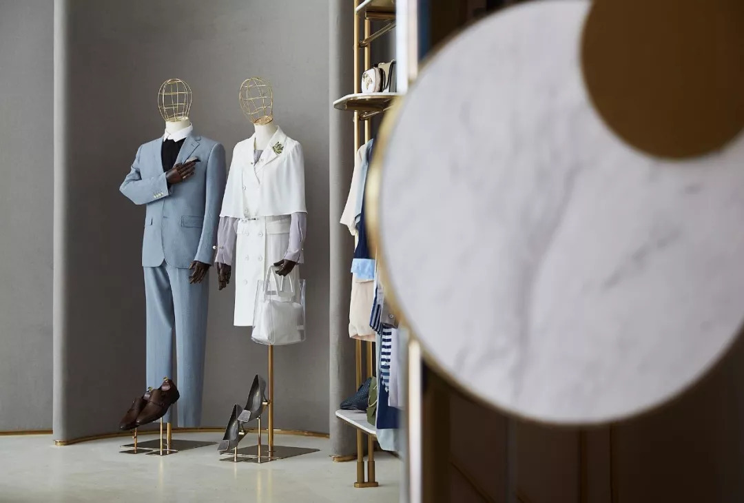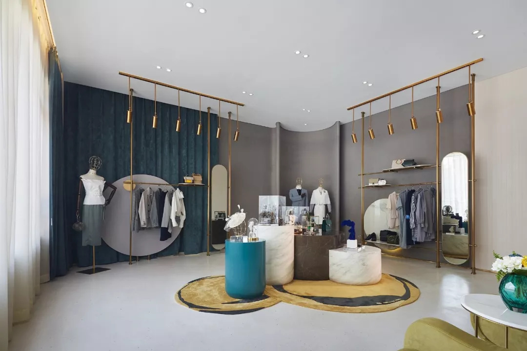 在1F成衣、飾品、配飾展示廳,幾何圖形與線、面的搭配,呈現時尚又不失大氣,大面積的高級灰,大理石、金屬等搭配精致而富有藝術感,連貫而富有詩意地形成空間的優雅品位。