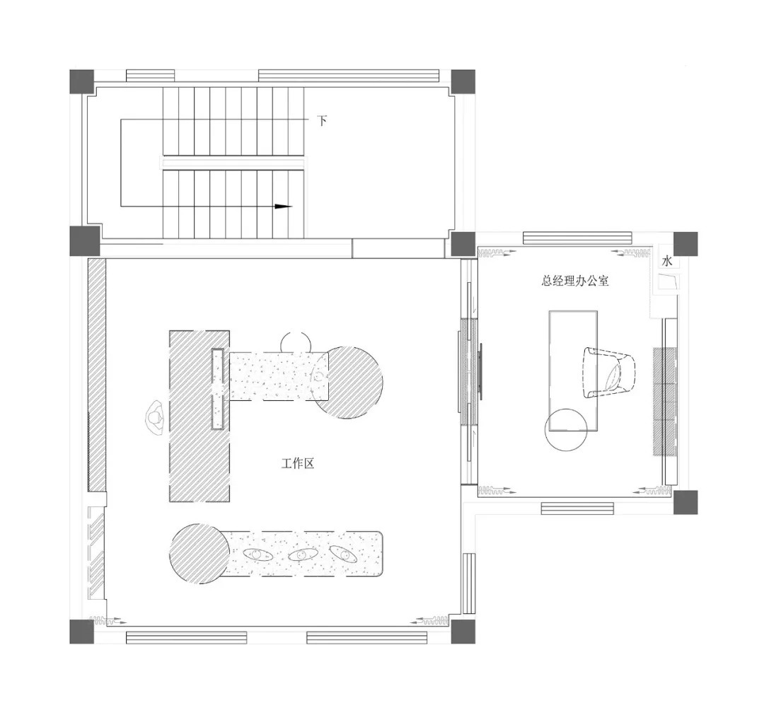 工作室的室內設計由集艾設計擔綱,合作過程中緊密溝通,并且,則靈藝術將室內的設計元素沿用到軟裝設計上,力求從設計語言上保持一致,實現軟硬裝融合。