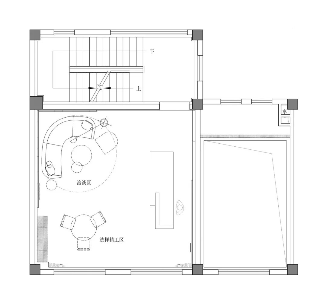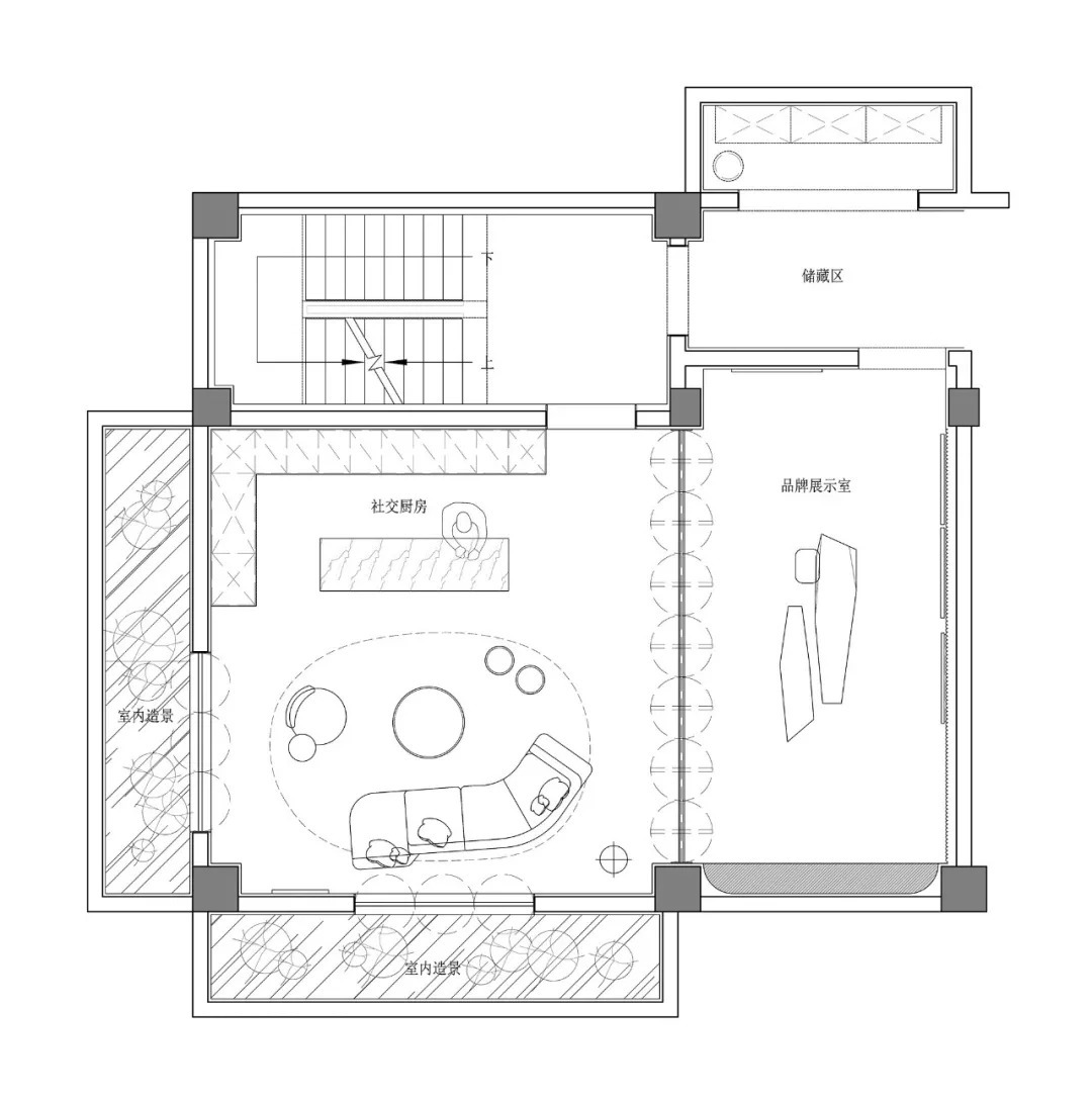 真正的藝術呈現是基于生活的形式與意義的再處理,為空間賦予獨特的藝術知覺。夾層的空間功能是私密聚會和服裝發布,設計營造氛圍,向參與者發出邀請。