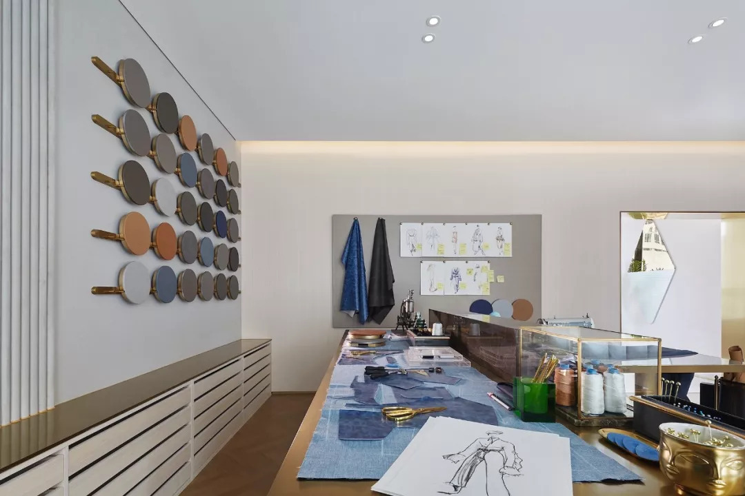 3F主要陳設了Fern Wu的工作流水臺——從小樣、色板、材質展示到毛料裁縫臺一應俱全——稀有、歷史感和手工定制是該空間的標志。