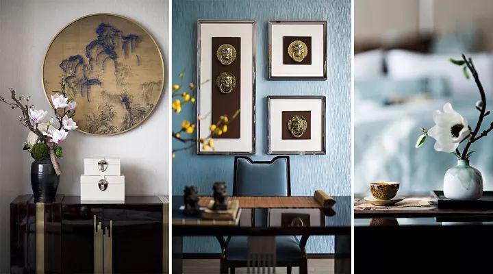簡(jiǎn)化改良版的中式書桌椅,散發(fā)著清雅氣質(zhì)之美,背后的組合裝飾畫更是別出心裁,畫中的獸首門環(huán),商周銅飾中早已有之。