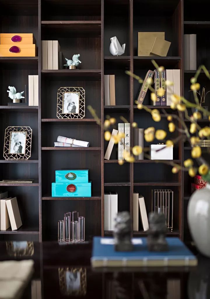 滿腹經(jīng)綸、一紙書香,提到文人我們總會(huì)有這樣的印象,書房設(shè)計(jì)最能體現(xiàn)人的精神世界。一個(gè)簡(jiǎn)約大氣、古色古香的書架占據(jù)了書房入口右側(cè)的整面墻壁,沉穩(wěn)的深木色,沉淀的優(yōu)雅。