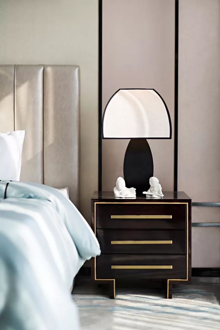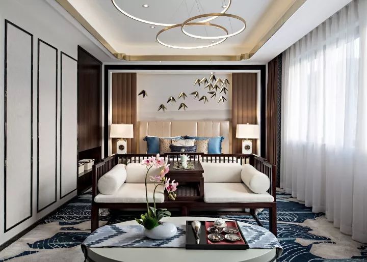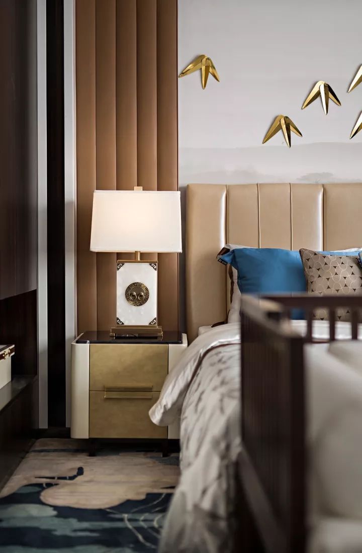 主臥套房位于安靜的五樓,散發(fā)著傳統(tǒng)意味的花紋地毯鋪陳于整個(gè)空間。床位的背景墻像一幅向兩側(cè)緩緩展開的山水畫卷,清淺、氤氳,韻味悠長(zhǎng),金色的竹葉裝點(diǎn)其間,將文人的“如竹之虛,如斯之雅”的君子風(fēng)度淡然書寫。