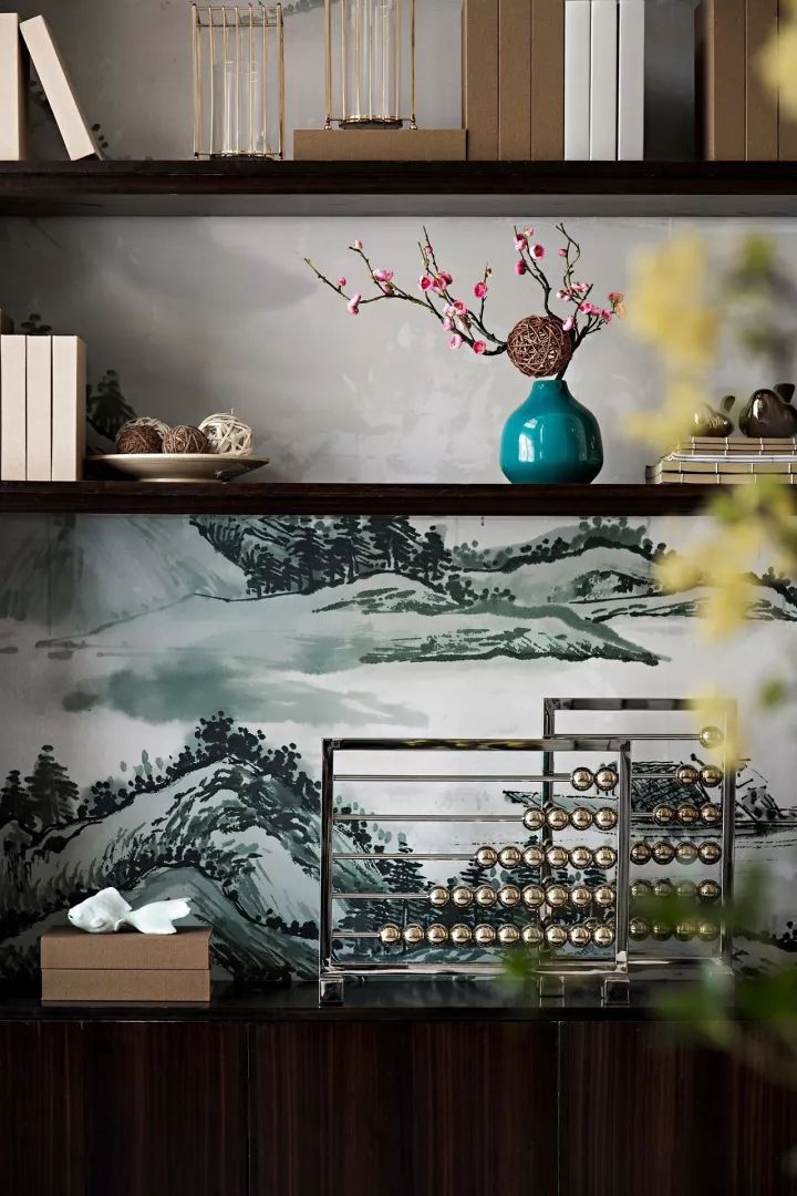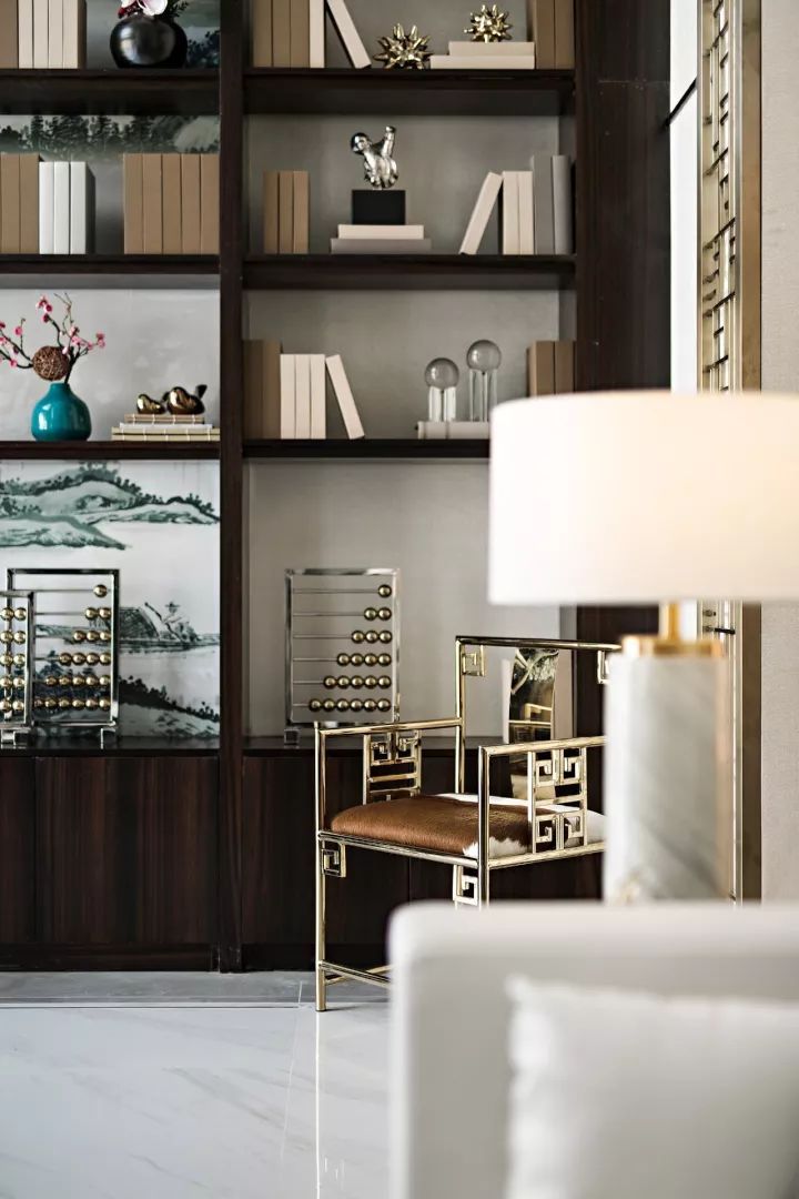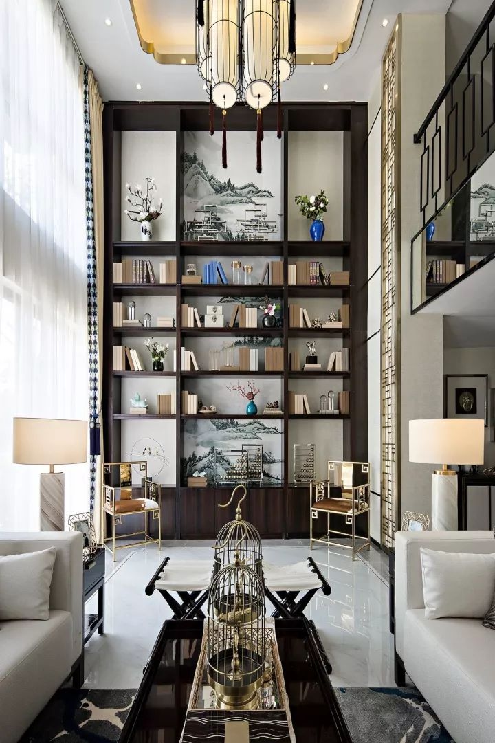 清雅的軟裝配色、木制長(zhǎng)幾及流蘇吊燈,盡是古意??臻g入口兩側(cè)以金色的傳統(tǒng)格紋裝飾鑲裹,與二樓的黑色扶欄呼應(yīng),大氣雅致,獨(dú)具傳統(tǒng)情調(diào)??蛷d另一側(cè)是高至天花的大型書架,山水墨色藏于其間,營(yíng)造出懷抱清曠,幽深雅致的空間氛圍。