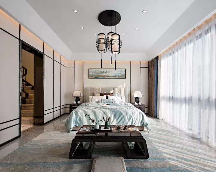 次臥設(shè)計(jì)以清淺的水藍(lán)色為主調(diào),同色系的水流紋地毯、山水掛畫,于虛靜中賦予空間靈動(dòng)氣韻。古雅的流蘇吊燈與壁柜的黑色線條呼應(yīng),委婉清秀。黑色的傳統(tǒng)案幾,將謙和與寧謐的心境定格。