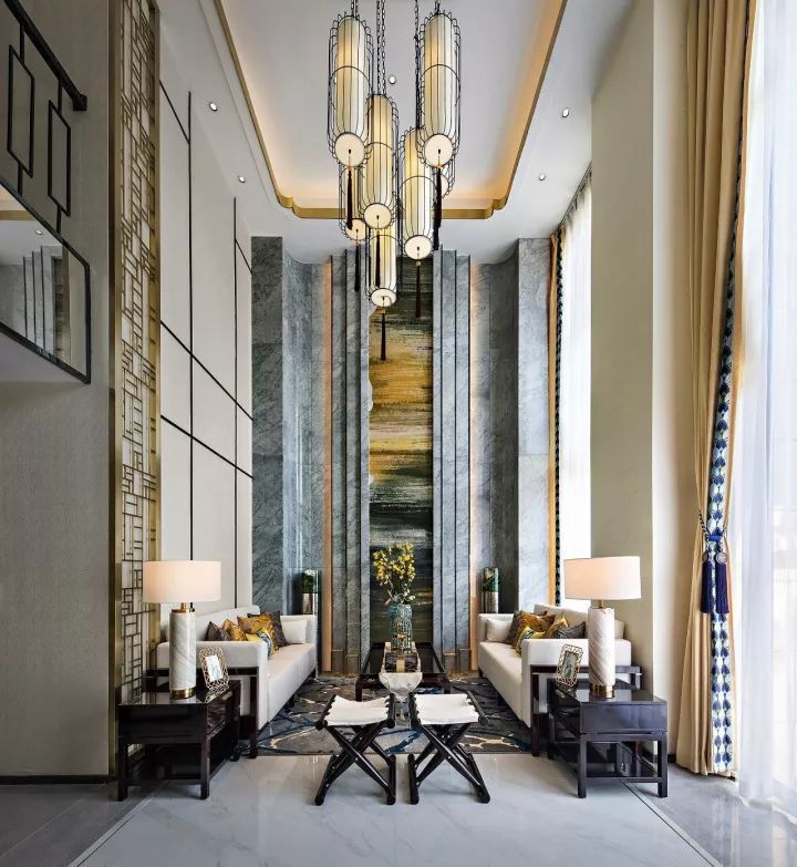 客廳空間挑高設(shè)計(jì),縱向格局,磊落翩然,特別是碧玉大理石裝飾墻,溫潤(rùn)清通,彰顯“談笑有鴻儒,往來(lái)無(wú)白丁”的儒雅風(fēng)范。