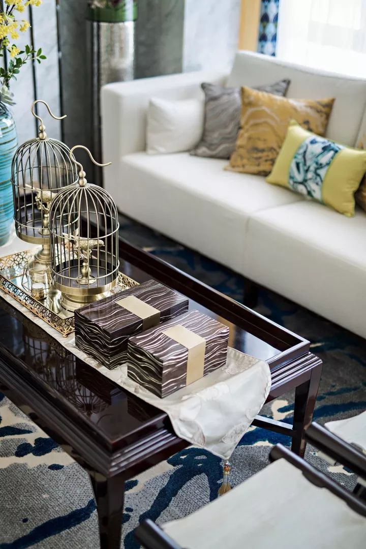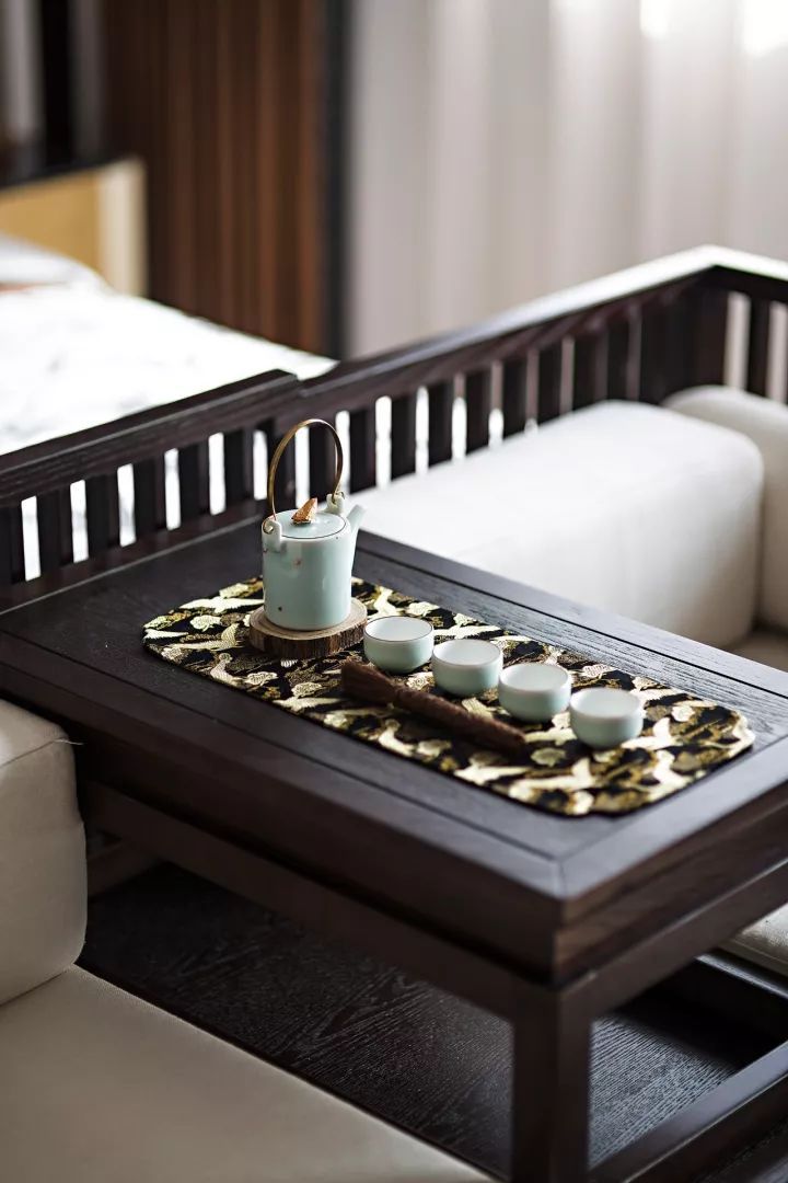 主臥空間還該特設(shè)一隅以作品茗區(qū),傳統(tǒng)的家具制式,結(jié)合現(xiàn)代的純白色軟包和中西合璧的圓桌,盡顯新中式設(shè)計(jì)的魅力。時(shí)有寒暑,月有晦明,而心靈張弛有度,可于此安放。