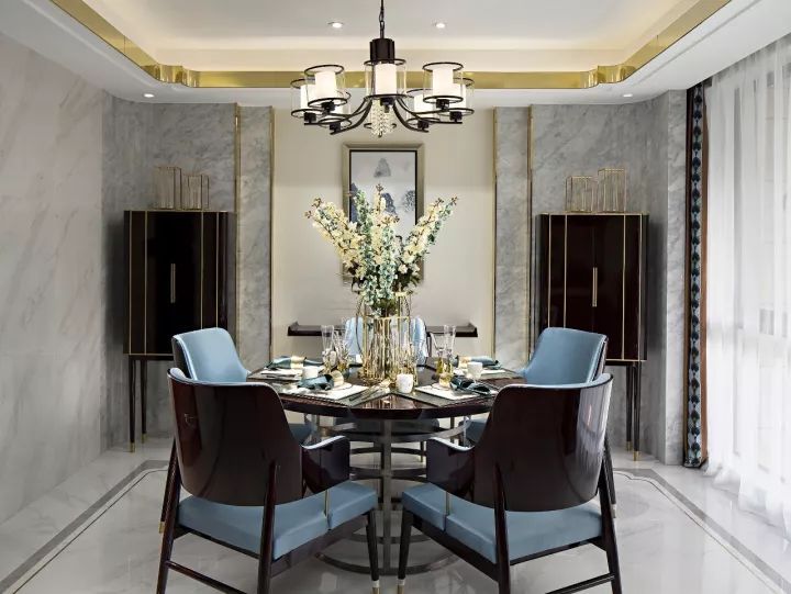 餐廳設(shè)計(jì)現(xiàn)代而不失整體的中式韻味,傳統(tǒng)的對(duì)稱布局嚴(yán)謹(jǐn)合度。在材質(zhì)的選擇上適當(dāng)加入玻璃和金屬等現(xiàn)代的裝飾材料,樣式新穎的餐椅和酒柜在細(xì)節(jié)處糅合了宋代家具設(shè)計(jì)美學(xué)。西式餐具于優(yōu)雅里凸顯莊重自得的心態(tài),清新花藝營(yíng)造出馨香深遠(yuǎn)沁人心脾的就餐氛圍。