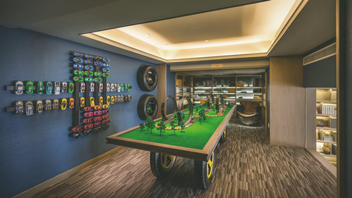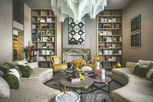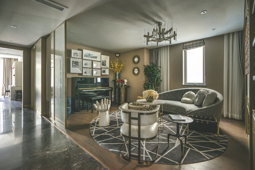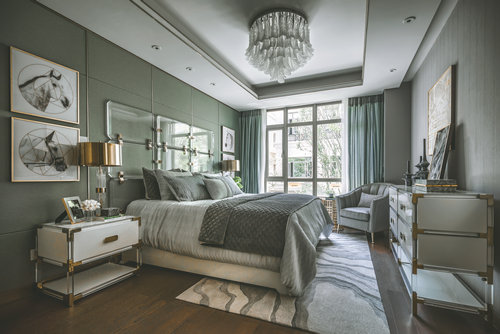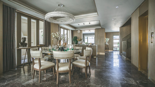 客廳與餐廳的設計中,高貴的氣質在祖母綠與高級灰結合的剎那占領整個空間,在溫潤如玉的質感與盈透的色澤中,彰顯著無與倫比的誘惑魅力。 她說:我想要讓身處其間的人,在妙曼的視覺感受之后,發現有某些元素能夠觸碰我們內心的原點。配合著極簡的設計構思,餐廳室內空間設計在材質的鋪陳和搭配上表達了現代設計的特質,祖母綠的餐具與精致的花藝點綴于餐桌上,使得空間層次分明。聚會廳的空間中,溫潤的黃翡色澤介入,材質的混搭與精致的工藝形成一場精心的鋪排,簡潔有力的設計語言,抽象的藝術畫與精致雅趣的飾品在同一空間并置。在聚餐廳,你可見獨具風情的鉚釘元素餐椅,來自歐洲的復古家具,宛若白流蘇一般的水晶吊燈,圖案獨特的地毯與精美的花藝,交疊出藝術的格調。