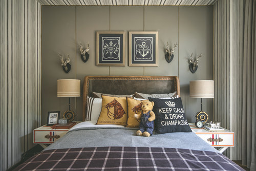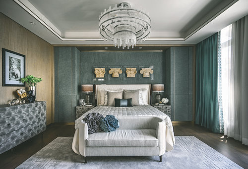二層、三層為不同主人的臥室空間,均以營造靜謐為前提,用不同程度的灰色糅合現代風尚,在內斂與品質之外,加入異域元素的融入。家庭廳在舒適和藝術之間達到共振,圓形沙發與白色皮質單椅的圍合,讓家人相處的時間融洽自然,墻面掛飾稍作點綴,地毯仿佛一幅裝飾畫,大面積提升空間的裝飾感。主臥休息室主調為灰色,整體空間莊重內斂,銅質飾品的介入,形成一脈形成的藝術感。主臥的設計中,設計師將古舊粗獷的古羅馬建筑元素提煉成了床頭的藝術裝置,用精巧的方式將宏大的敘事載入空間,克制的色系與浪漫的表達形成了東方和西方的對話。次臥用不同程度的灰色糅合現代風尚,特殊定制的亞克力床頭和邊柜,空間中的掛畫、飾品以簡潔的形式呈現,極致的簡練和輕盈的浪漫并存。男孩房以精致的格紋與幾何線條的延伸界定了空間的格調,歐洲建筑圖案為背景的單椅和精心布置的藝術品,讓空間更具情景化,純真浪漫。書房中,簡練的色調,奔放的斑馬紋地毯與精致的皮藝形成視覺上的張力,凸顯經典與現代的交織感。